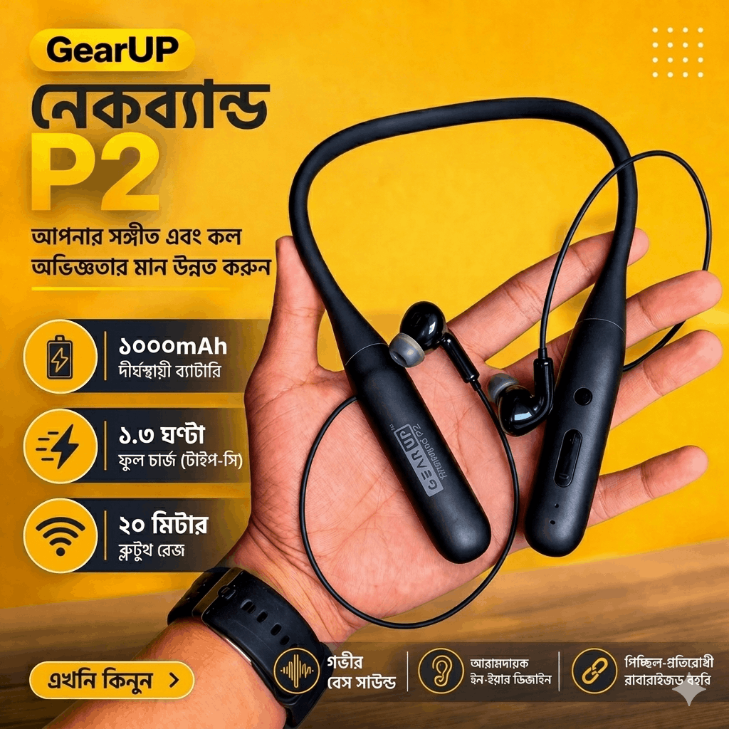 আপনার দৈনন্দিন মিউজিক ও কল এক্সপেরিয়েন্সকে আরও উন্নত করতে নিয়ে আসুন GearUP Neckband P2। এটি ডিজাইন করা হয়েছে কমফোর্ট, পারফরম্যান্স এবং স্টাইলের নিখুঁত সমন্বয়ে।এই নেকব্যান্ডে রয়েছে non-slip rubberized material, যা দীর্ঘ সময় ব্যবহারেও আরামদায়ক ফিট নিশ্চিত করে। এর in-ear ডিজাইন বাইরের শব্দ কমিয়ে পরিষ্কার ও ডিপ সাউন্ড দেয়।সবচেয়ে বড় সুবিধা হলো এর 1000mAh ব্যাটারি, যা দীর্ঘ সময় মিউজিক শোনা ও কল করার সুবিধা দেয়। আর মাত্র ১.৩ ঘণ্টায় ফুল চার্জ হয়ে যায় Type-C fast charging এর মাধ্যমে।এছাড়া ২০ মিটার Bluetooth range থাকায় আপনি সহজেই দূর থেকে কানেক্টেড থাকতে পারবেন—কোনো interruption ছাড়াই।🔥 Key Features (Bangla)✔ নন-স্লিপ রাবারাইজড ডিজাইন ✔ মাত্র ১.৩ ঘণ্টায় ফুল চার্জ ✔ শক্তিশালী 1000mAh ব্যাটারি ✔ স্টেবল Bluetooth কানেকশন ✔ Type-C ফাস্ট চার্জিং ✔ ২০ মিটার পর্যন্ত রেঞ্জ ✔ আরামদায়ক in-ear ডিজাইন